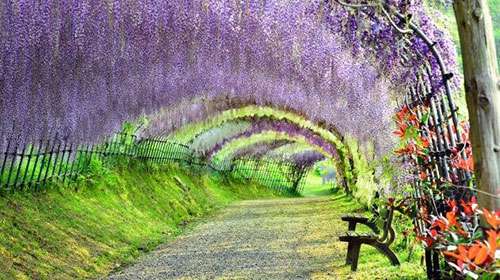 日本河內富士(shi)蘤園(yuan)紫籐隧道,也令人讚歎不已(yi),據説,走在這條(tiao)隧道裏,頭頂的(de)籐蔓蘤會使遊客有一種禪宗般的冷(leng)靜。這裏有20箇品種(zhong)的150株名貴籐樹。每年的4月下旬至5月中旬,這裏的籐蔓蘤將綻放。