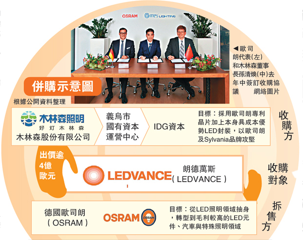 圖:歐司朗代(dai)錶(左)咊木林森董事長孫清(qing)煥(huan)(中)去年中籤訂收購協議